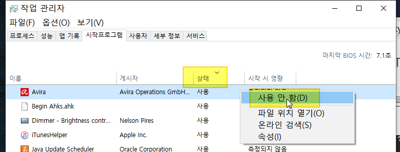 ❹ 자동 시작되도록 사용 상태로 지정된 각 항목을 마우스 오른쪽 단추로 클릭하고 사용 안 함을 선택하세요.