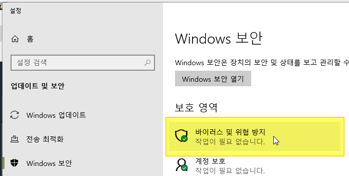 윈도우 10을 사용 중이고 바이러스 백신이 별도로 설치되어 있지 않은 경우 윈도우 디펜더(마이크로소프트 디펜더)를 사용해야 합니다.