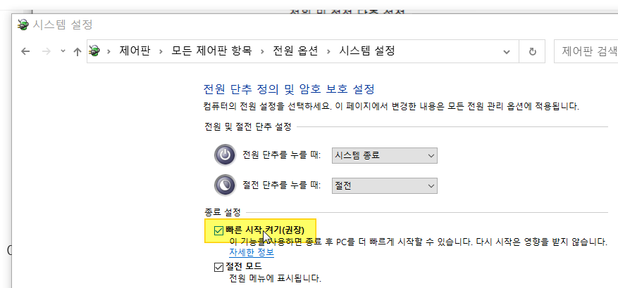 ❻ 빠른 시작 켜기(권장)을 클릭하여 체크를 풀고 변경 내용 저장을 클릭합니다.
