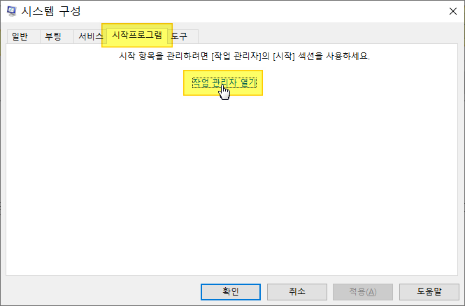 ❸ 시작 탭을 선택하고 작업 관리자 열기를 클릭합니다.