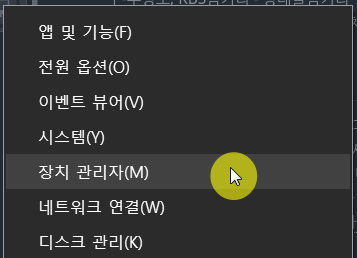 ❶ 윈도우 10(Windows 10)의 시작 버튼을 마우스 오른쪽 버튼으로 클릭하고 장치 관리자를 선택합니다.