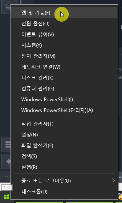 ❶ 시작 버튼을 마우스 오른쪽 버튼으로 클릭하고 앱 및 기능을 선택합니다.